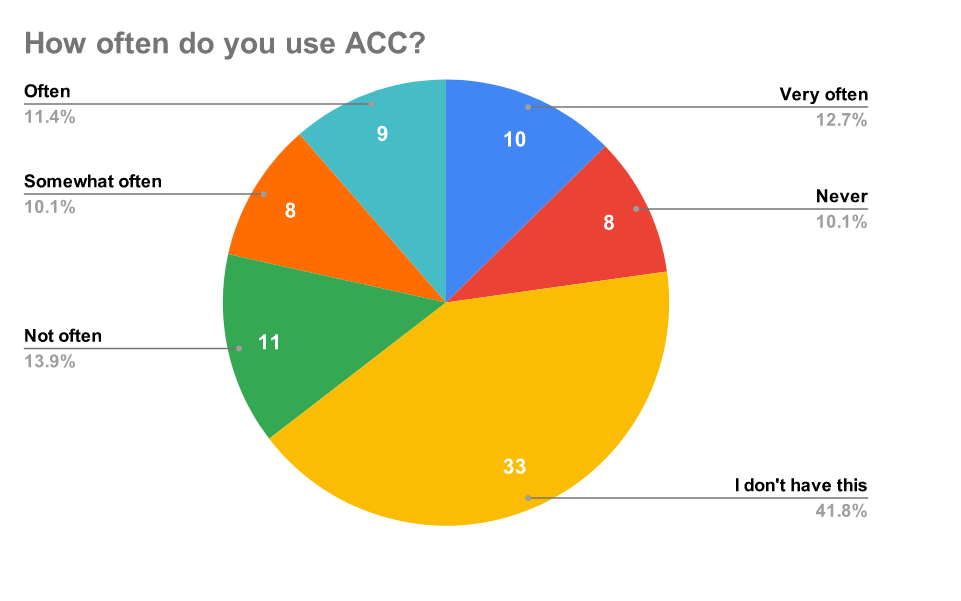 For the feature ACC, we found that although participants tended to know what it was, many of them didn't have said feature, and those that did have the feature were split in frequency of usage.