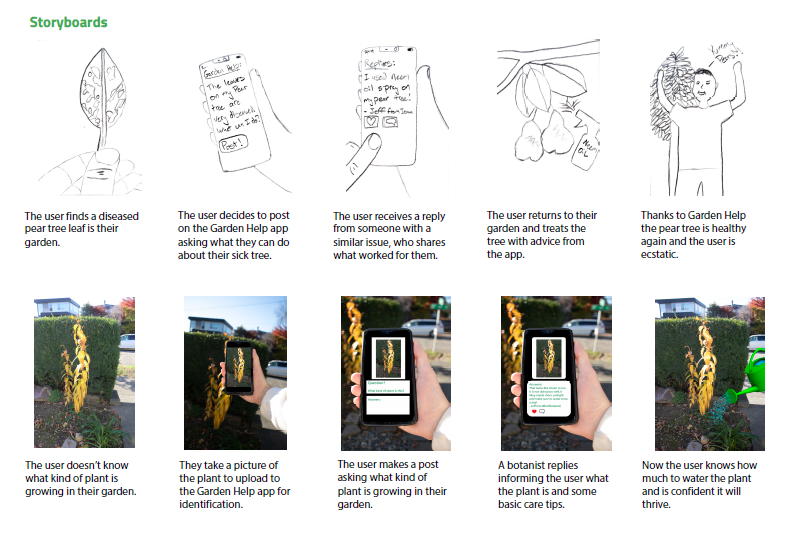 Paper prototypes and sketches cannot often convey the experience of the design in use, narratives such as scenarios and storyboards help convey the experience of design ideas. So each person in your group created a storyboard for different scenarios and experiences that a user might have using Plant Studio. Each storyboard is associated with one potential design solution problem a user might have and our team merge our the ideas to create our prototypes.