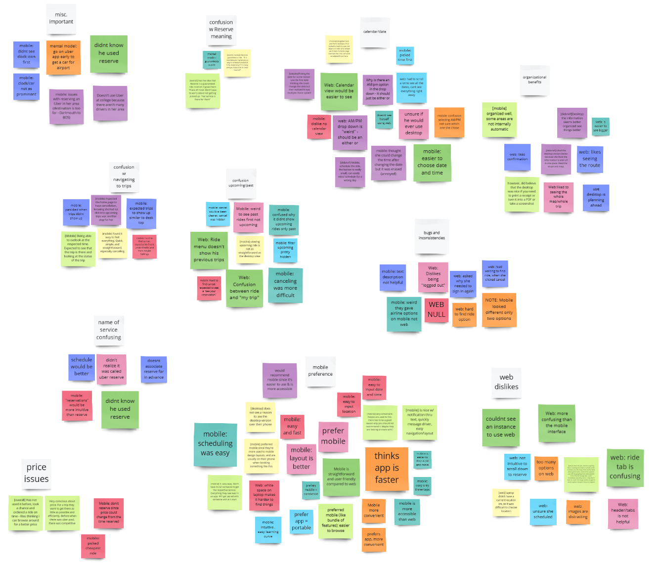 In conducting the usability tests, the team created the roles of a moderator as well as a note taker. This distribution of responsibilities allowed for an enhanced focus on each role, ensuring that the moderator was not unfocused due to note taking responsibilities and vice-versa. Following the completion of the usability testing the team began affinity diagramming to unify ideas and concepts that participants discussed during the study. Given the large quantity of data, grouping based on pain-points or positive experiences allowed the team to have a better overview of what changes to the usability of the Uber interface might be valuable.