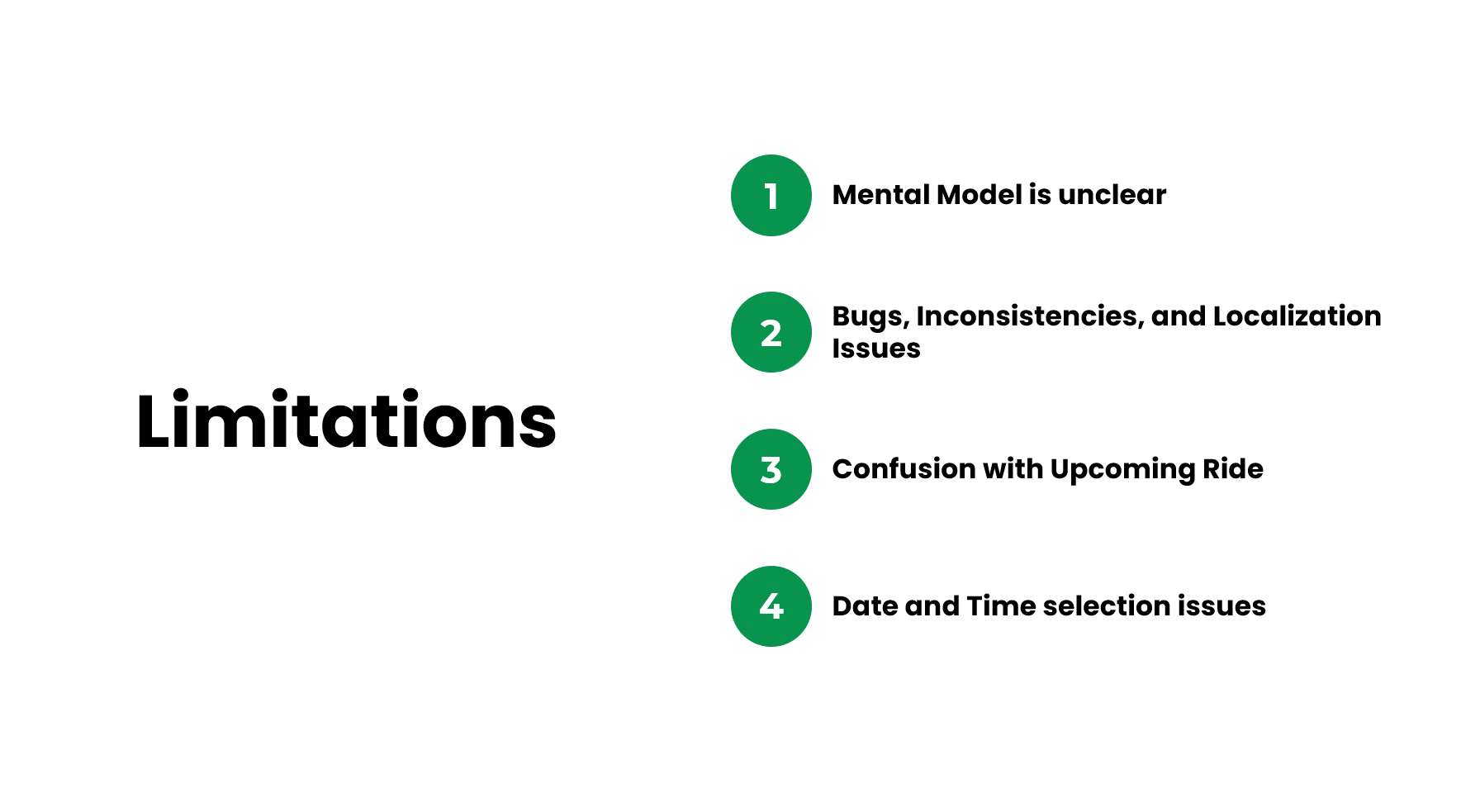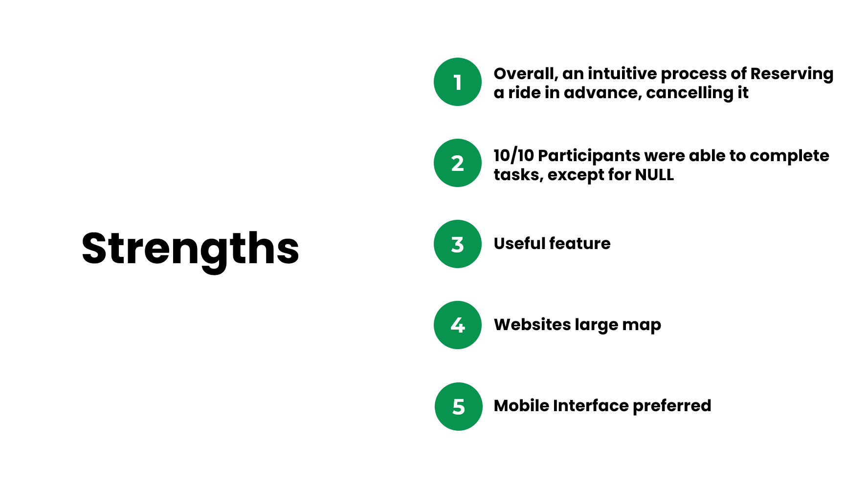 Following the analysis of our results our team began outlining the strengths and limitations of both the web and mobile Uber Reserve interface. The strengths and limitations functioned as a summary of the following seven findings: