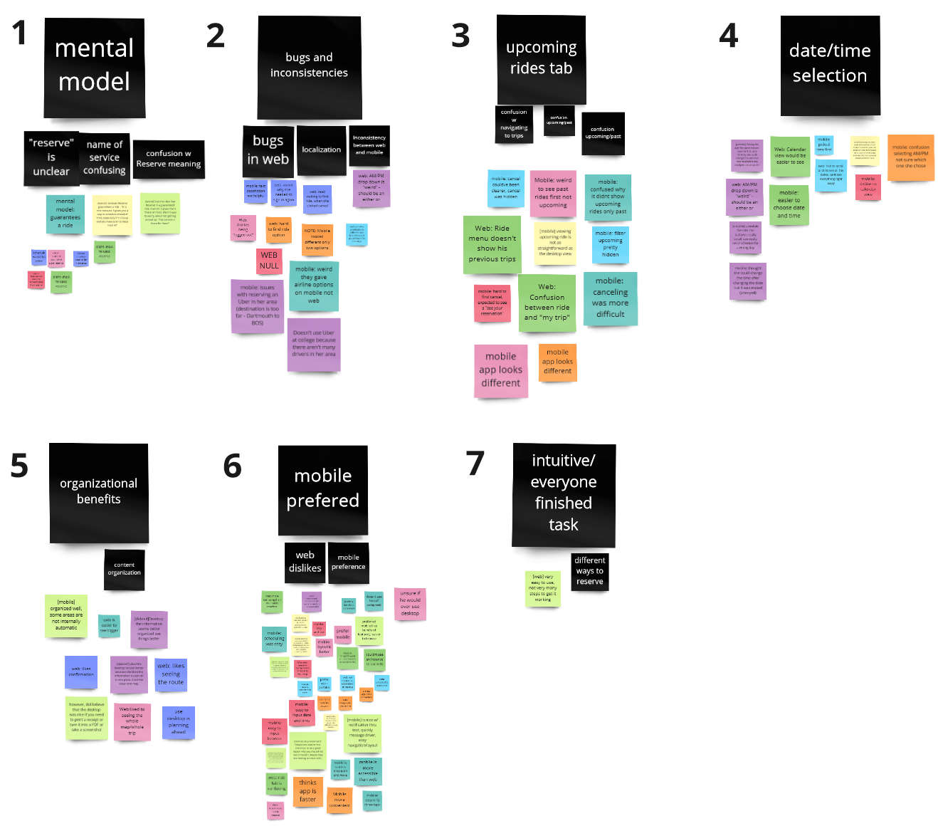 Using a Miro board to create the affinity diagrams allowed the team to easily distinguish between the users through color, as well as offering the benefit of enhanced collaborative features and the ability to revise and revisit ideas. Given the groupings of the pain-points the team was able to identify 7 key issues, shown below in black which highlighted shortcomings in the usability of the Uber reserve interface.